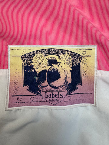 Seltenes ausgefallenes Design aus den späten 80s/frühen 90s. Die Aufnäher „AK-SAR-BEN“ und „Golden Surprise – Labels of Every Description“ sind Reproduktionen historischer kalifornischer Obst- bzw. Zitruskisten-Etiketten. Beispielsweise war Ak-Sar-Ben ursprünglich eine Orangenmarke aus Tulare, Kalifornien (Wortspiel „Nebraska“ rückwärts)