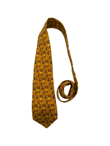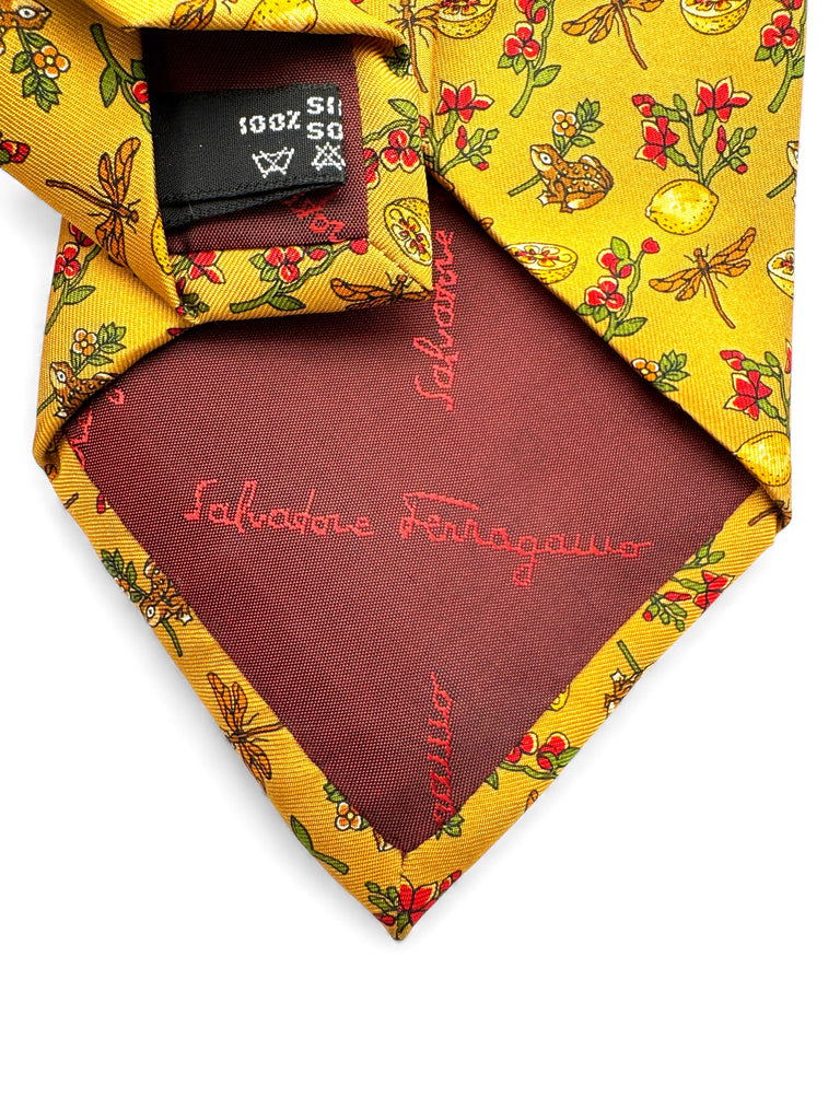 90s Salvatore Ferragamo Krawatte Dragonfly Bunny Floral Print Seide Made In Italy Gelb/Gold