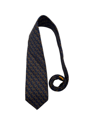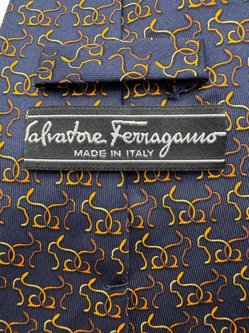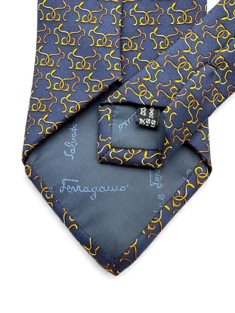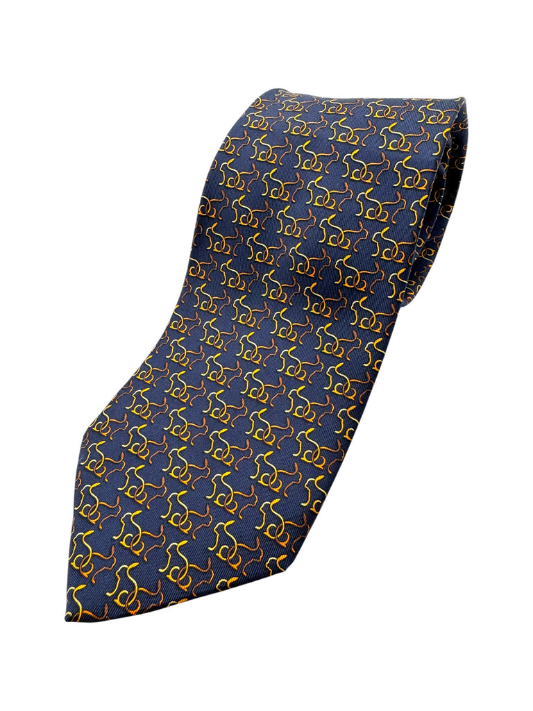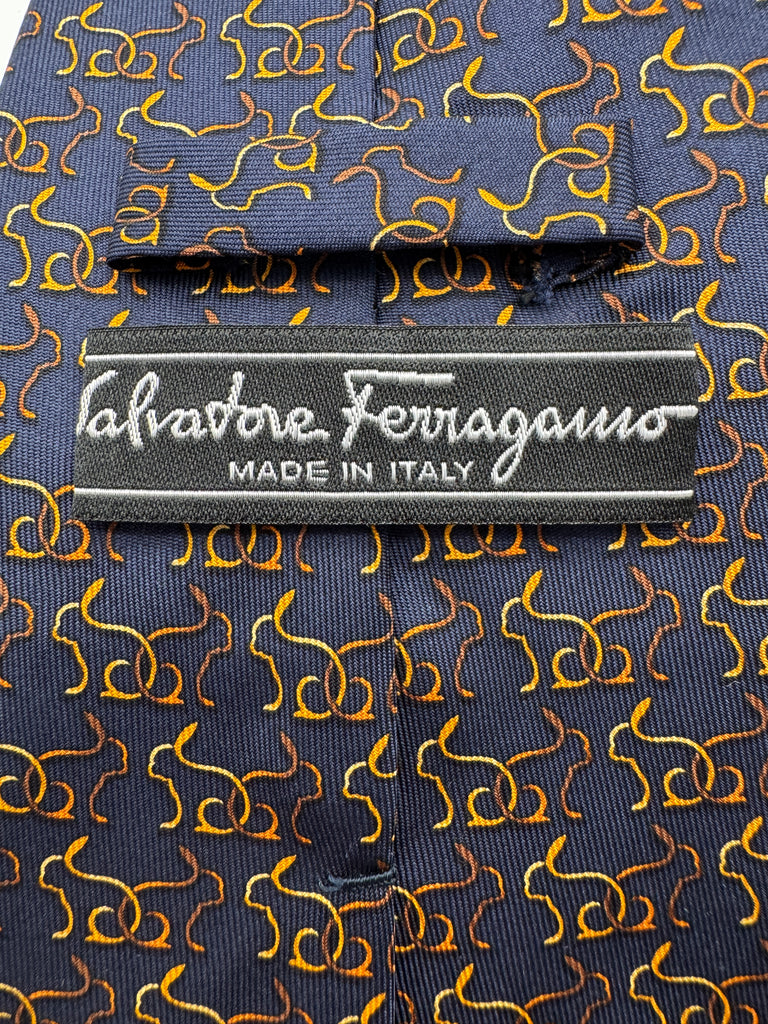 90s Salvatore Ferragamo Krawatte Rabbit Silhouette Print Seide Made In Italy Dunkelblau Gold