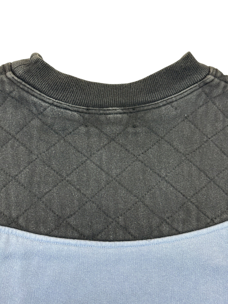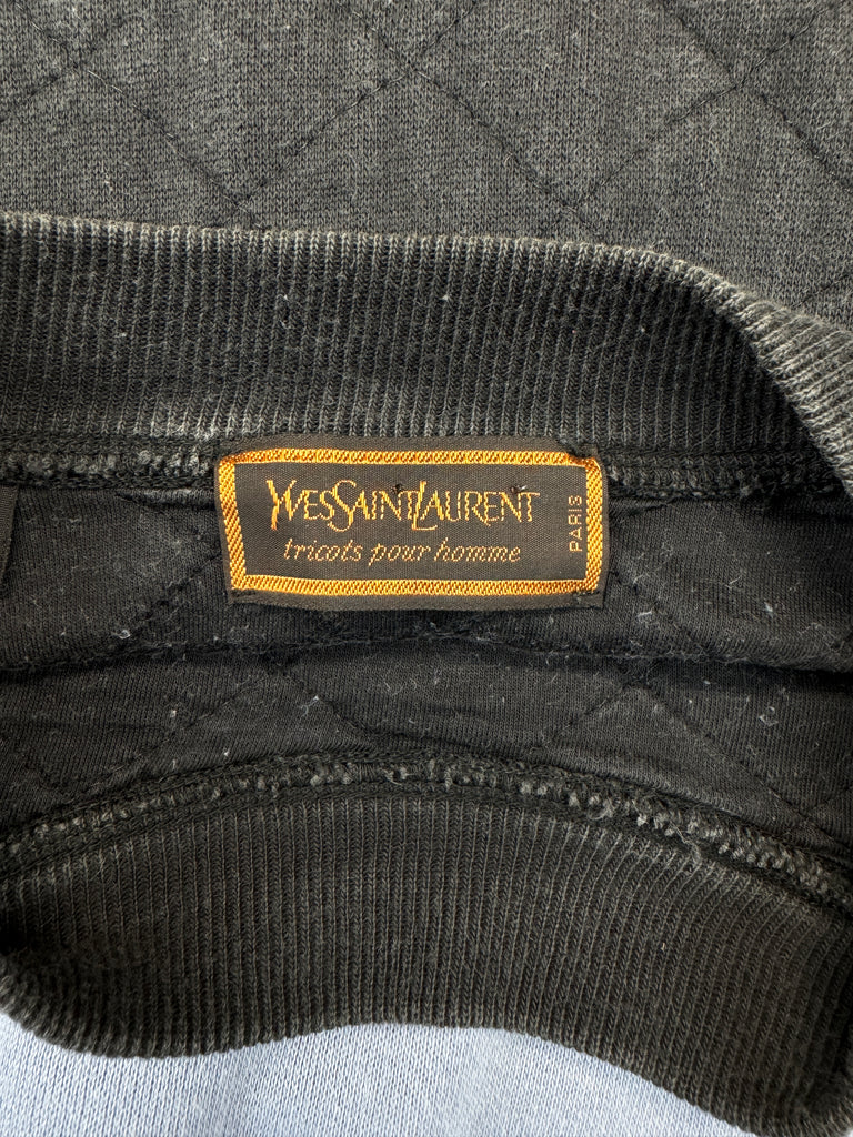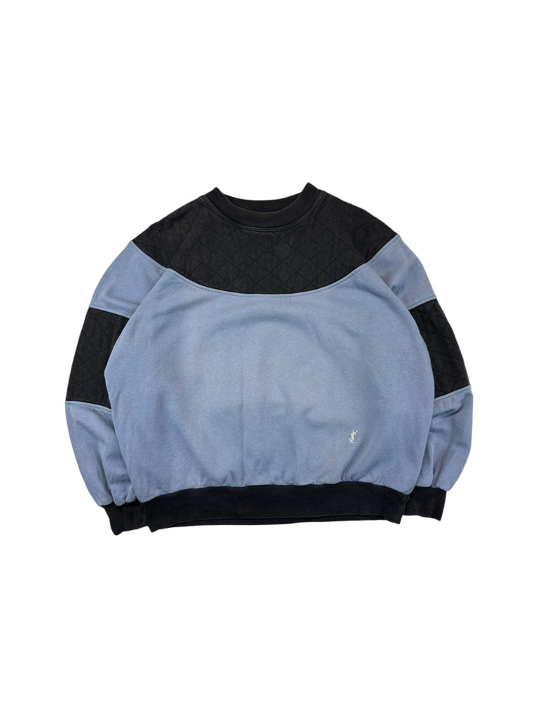 Seltenes YSL Vintage Sweatshirt mit zweifarbigem Design in Schwarz und Hellblau. Oberer Schulterbereich und Ärmel aus gestepptem Material, kombiniert mit weichem Baumwollbody. Dezentes Yves Saint Laurent Logo-Stitching vorne. Lockerer Fit, perfekter Zustand für ein 80s/90s Piece.